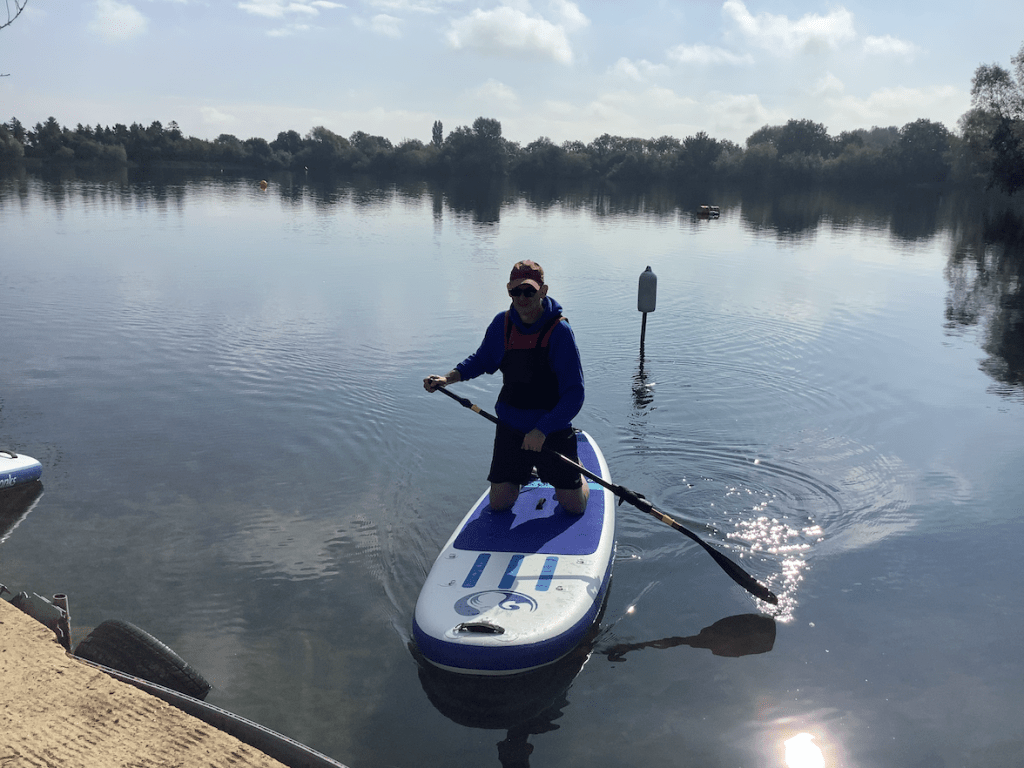I had my first attempt at paddle boarding today, Paloma got me sorted out with board and buoyancy aid, but I decided it wasn’t cold enough for a wet suit, which really needs to be wet to be effective. I soon got the hang of it; to begin with, paddling on one side seemed to be pushing me to the other side, but with some practise I was able to maintain a moderately straight course. As it was my first time I stayed on my knees for extra stability. In the distance I spotted a couple of ladies on boards and thought it might be a good idea to follow them and learn from their technique. Unfortunately, they were moving far faster than I was and I never caught up with them. Still, once I knew what I was doing it was a very relaxing experience, watching the lake bed slide past underneath, reflections of vapour trails and clouds from above. I decided not to bring my sound recorder out with me, just in case!